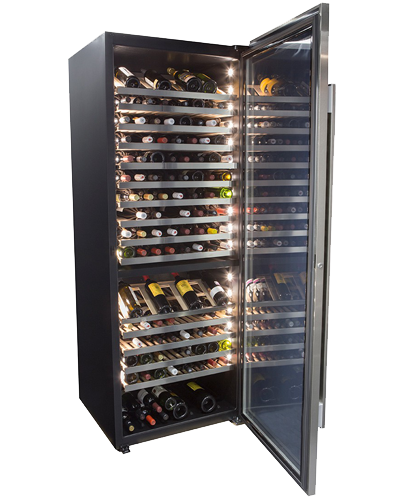 Capacidad hasta 259 botellas · Cerradura de seguridad · Display digital Doble compartimento (control de temperatura independientes) · 13 Bandejas de madera removibles con frontal de acero y sistema de rieles · 1 bandeja expositora