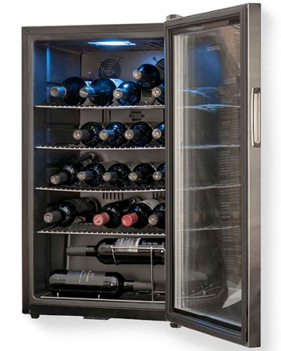 Capacidad hasta 28 botellas · Cerradura de seguridad · Sistema de frío Compresor · Sistema de temperatura enfriador · Display digital de doble función (Config. Temp. y Temp. real) · Bandejas Metálicas.